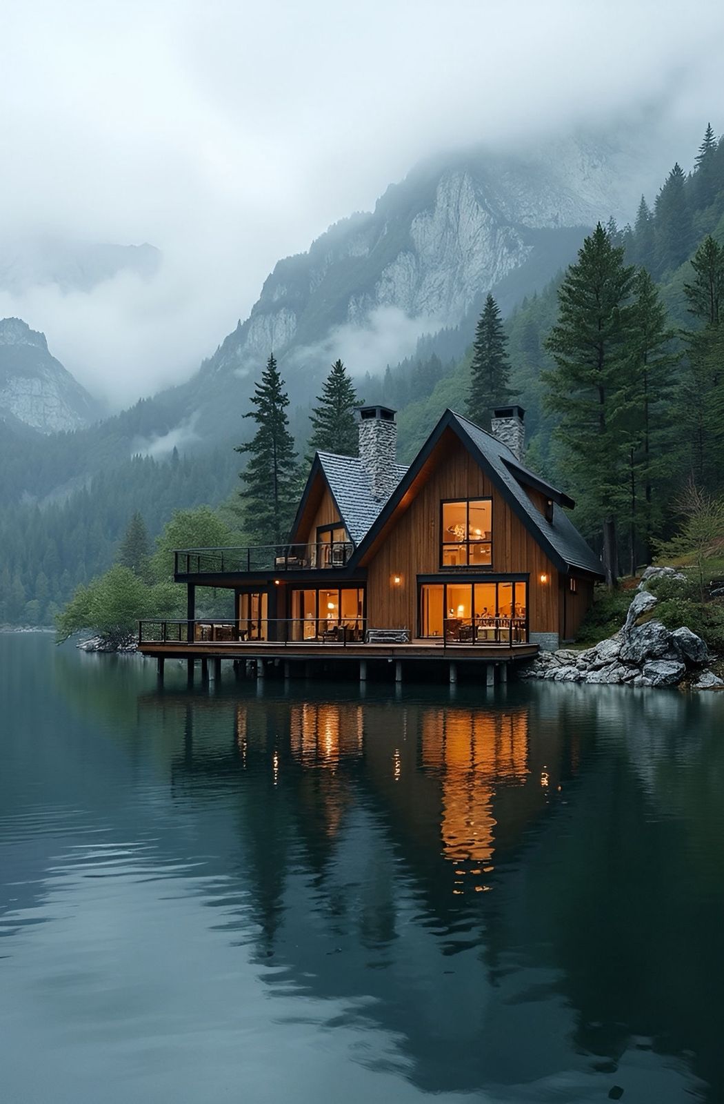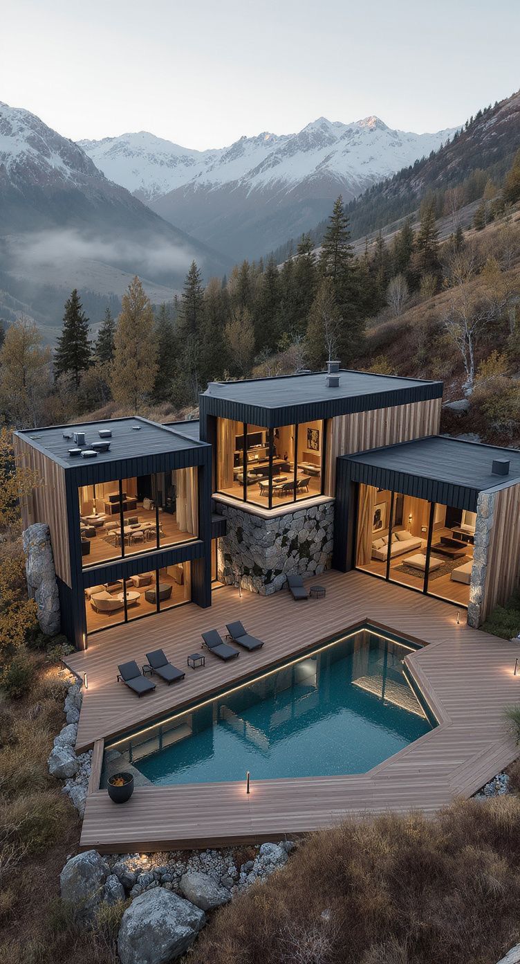 - поражает необычной архитектурой. Дома выполнены в минималистичном стиле с черным алюминиевым профилем и полностью прозрачными стеклянными стенами, создавая эффект парения среди деревьев